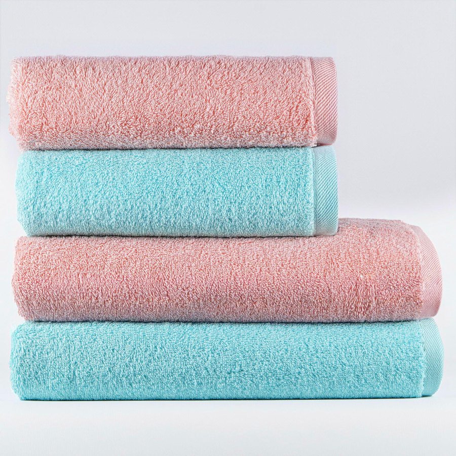 Juego de 4 Toallas de rizo lisas Modelo "Exclusive" en colores Rosa y Azul Celadón. 100% algodón peinado con una densidad de 600 grs/m2. Suave y muy absorbente.